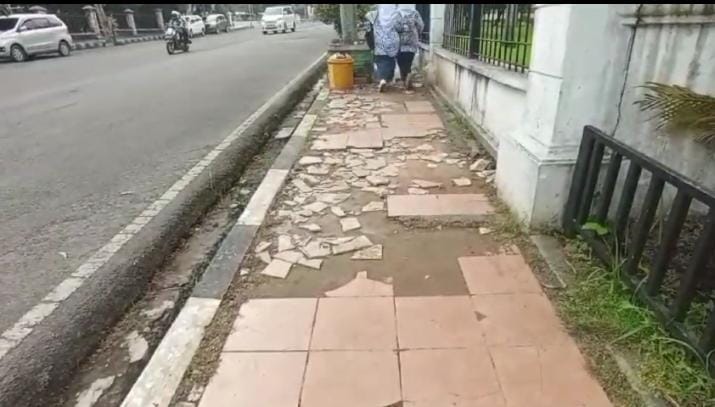 Selain lantai ubin tempat berolahraga banyak yang terkelupas, juga terlihat dengan adanya fasilitas jogging track dan trotoar yang berlubang.