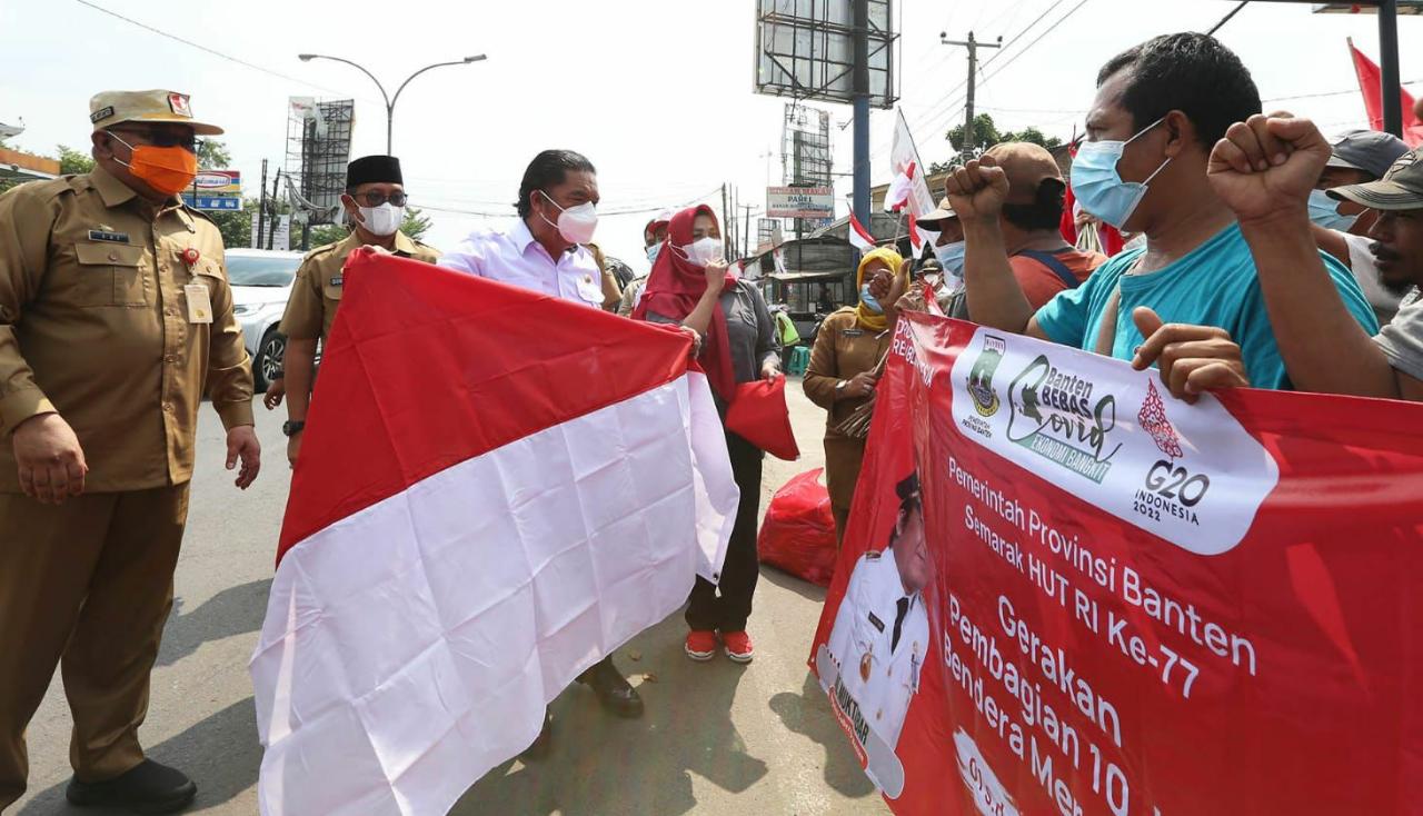 Pj Gubernur Banten Al Muktabar bersama rombongan sempat melakukan pembagian Bendera Merah Putih kepada para pengguna jalan dan warga yang ada di ruas Jalan Raya Serang-Pandeglang, Palima, Jalan Syekh Nawawi Al Bantani, dan Perempatan Boru, Kota Serang. ***