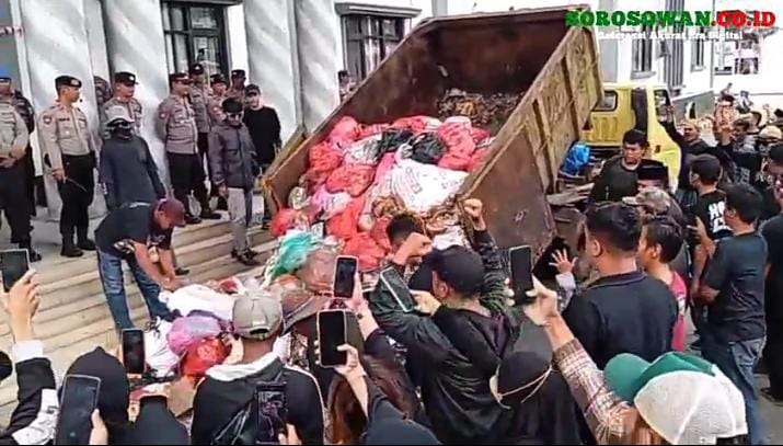 Selain berorasi dan mengusung-usungkan poster bertuliskan kecaman, para pendemo di unjuk rasa kali ini juga menaburi halaman kantor kepala daerah setempat dengan satu ton sampah rumah tangga, yang dibawa pendemo sebelumnya menggunakan truk engkel.